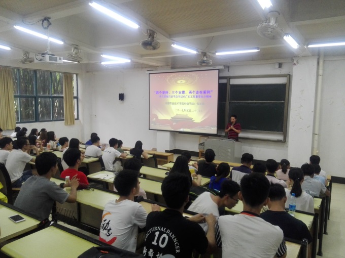 2017年5月23日下午,电信学院学生党支部在教学楼D107开展学习“习近平总书记对广东工作重要批示精神”专题讲座。出席人员有学生党支部全体党员、入党积极分子、专业团支部成员、15、16级各班长、团支部书记、各协会正副会长。由电信学院党总支徐国辉副书记主持,邹建辉老师主讲。