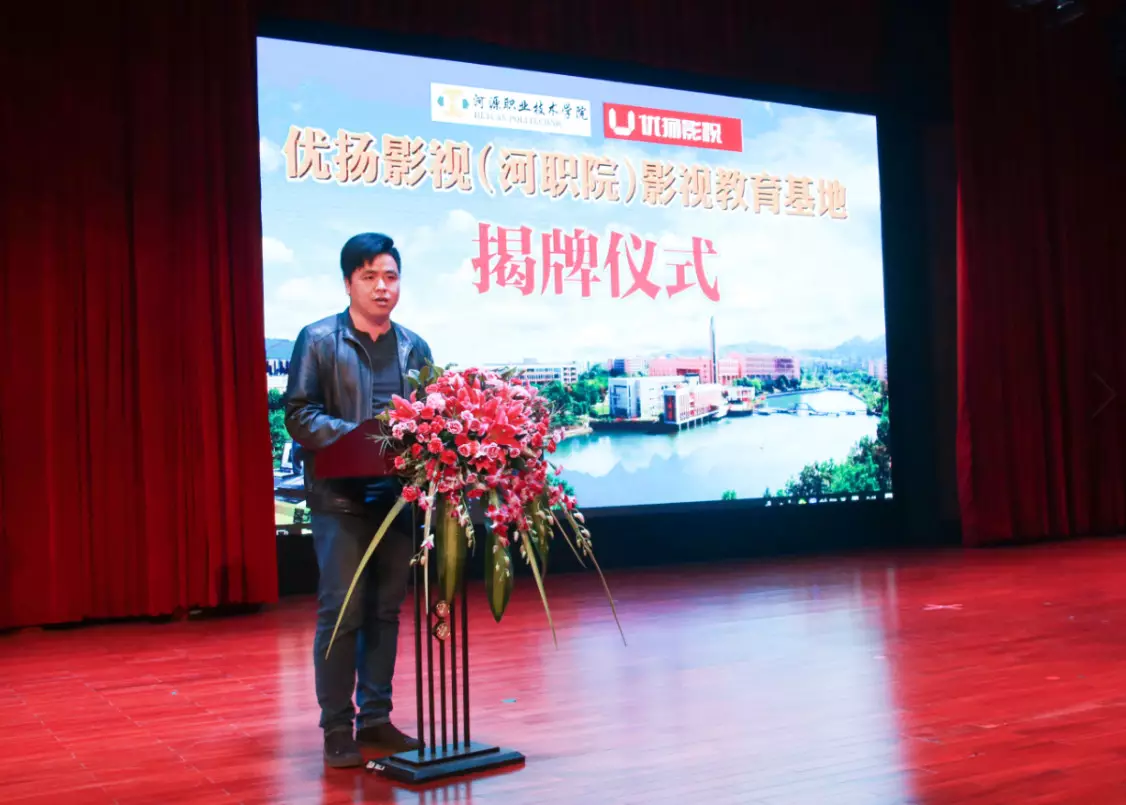 3月28日上午,“优扬影视(河职院)影视教育基地”揭牌成立仪式在艺术演播厅隆重举行。河源市优扬影视传媒有限公司(下简称:优扬影视)叶泉董事长、洪燕总经理以及公司相关人员,河源市文联副主席邹国忠先生、原河源市体育局局长古水桂先生、原河源市电视台副台长车济民先生、相关企业领导,以及我校电信学院、继续教育学院师生代表出席了仪式。