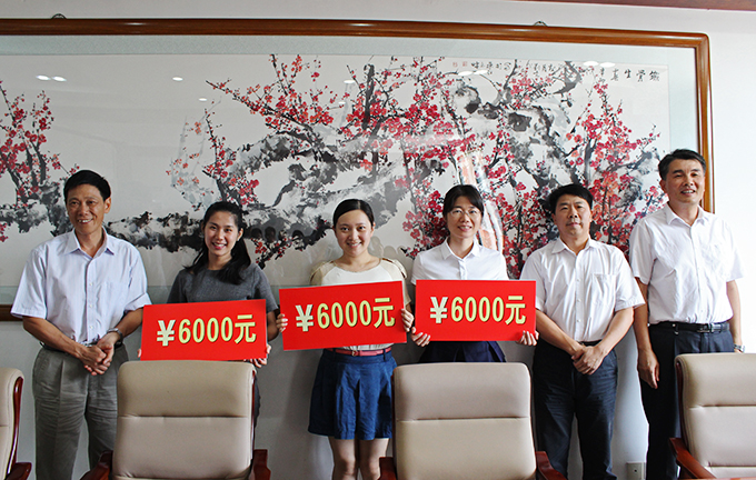 会议最后,校领导为获得国赛一等奖的导游项目组师生颁发奖金并合影留念。