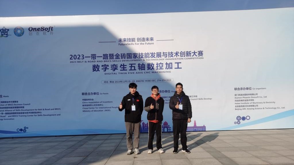 参加完2023-2024年度机械行业职业教育技能大赛“CAXA数码大方杯”工业数字化关键技术应用赛项后,我校师生又马不停蹄赶赴河北邢台参加2023年一带一路暨金砖国家技能发展与技术创新大赛数字孪生五轴数控加工赛项。该赛项于12月1日至3日在河北机电职业技术学院开赛,为个人赛,共有来自全国近四十支代表队参赛。数字孪生五轴数控加工是指利用五轴数控加工中心对工件进行金属切削加工的项目,以切削刀具去除材料方式来完成工件制作的过程。实际考核选手对五轴零件的读图、建模、数控程序编写、零件加工、检测等工作所需要的技术技能掌握的程度。我校派出邓登建、邝文钦两位同学参加了比赛,经过激烈的角逐,最终两人分获全国二等奖,叶增良、吕辉获得优秀指导教师,我校获得最佳组织奖。