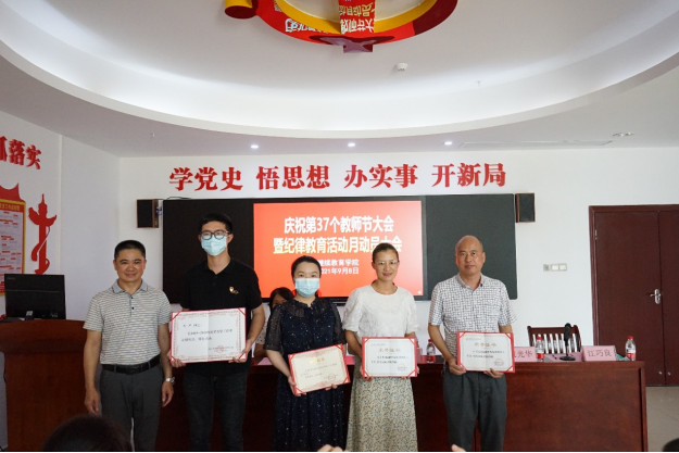 会议对获学校优秀党务工作者、优秀共产党员、先进基层党组织、先进教育工作者、学习强国学习标兵、广东省脱贫攻坚突出贡献个人等7位个人及1个集体进行表彰,陈德清校长、袁光华副校长分别为受表彰的老师颁发荣誉证书并表示祝贺。